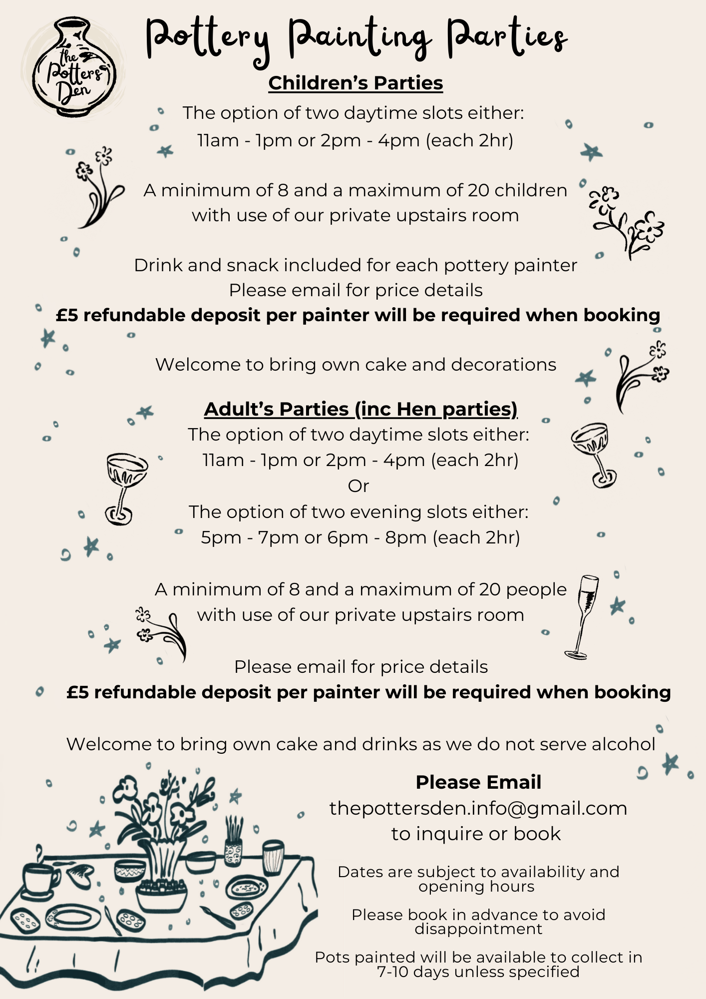 Pottery Painting Parties for all ages! Pottery Painting Parties for all ages! Pottery Painting Parties for all ages! Each child gets to pick a pot from our popular animal range! Adults can pick from our whole range & feel free to BYOB!